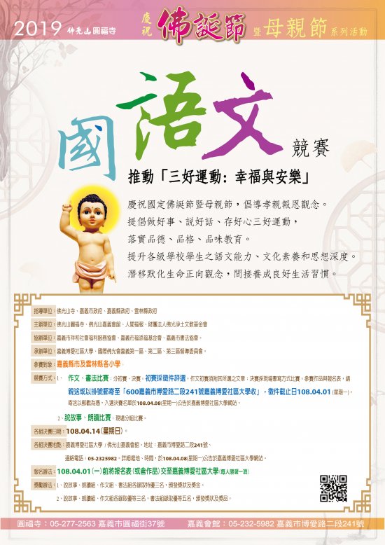 各組獲獎學生,將於 5 月 5 日(日)下午 2:00~5:00 報到領獎,確切報到地點、時間由本校電話或簡訊通知。 活動名稱:2019慶祝佛誕節暨母親節、閱讀嘉年華活動 地點:嘉義市政府前北棟廣場 時間: 14:30-15:00在舞台旁報到 備註:活動當天有蔬食品嘗攤位,敬請自備環保餐具響應環保 |