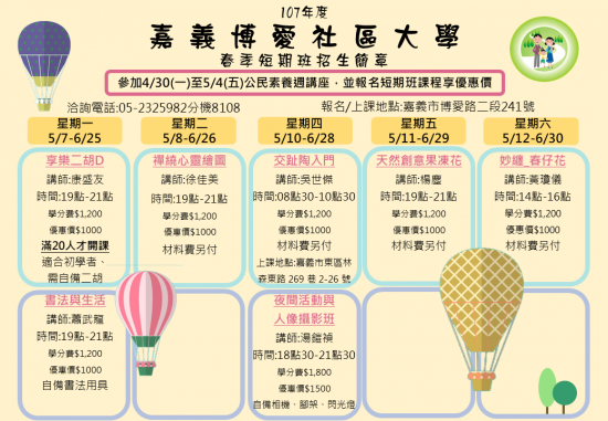 參加4/30(一)至5/4(五)公民素養週講座,並報名107春季班短期班課程享優惠價