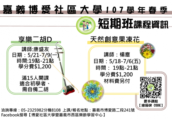 【已額滿】 講師:康盛友 時間:19點-21點 學分費$1,200 優惠價$1000 滿20人才開課 適合初學者、 需自備二胡 延兩周開課5/21-7/9 |